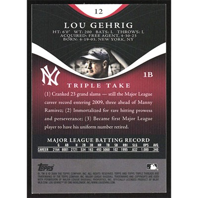This is a 2009 Topps Triple Threads Lou Gehrig baseball card. The card is #12 and pictures show condition. This card is limited; #'d /1350. Team(s): New York Yankees