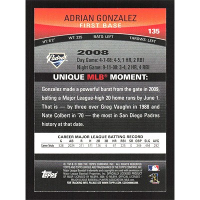 This is a 2009 Topps Unique Adrian Gonzalez baseball card. The card is #135 and pictures show condition.