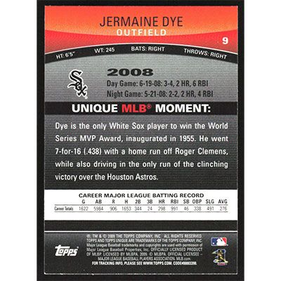 This is a 2009 Topps Unique Jermaine Dye baseball card. The card is #9 and pictures show condition.