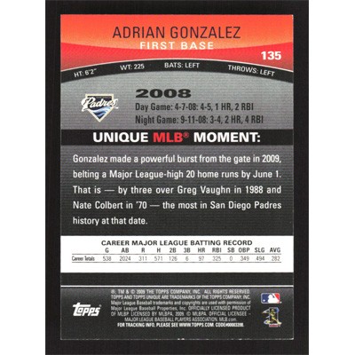 This is a 2009 Topps Unique Bronze Adrian Gonzalez baseball card. The card is #135 and pictures show condition. This card is limited; #'d 90/99. Team(s): San Diego Padres