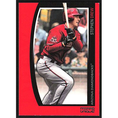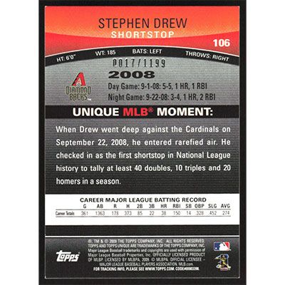 This is a 2009 Topps Unique Red Stephen Drew baseball card. The card is #106 and pictures show condition. This card is limited; #'d 0017/1199. Team(s): Arizona Diamondbacks
