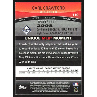 This is a 2009 Topps Unique Red Carl Crawford baseball card. The card is #110 and pictures show condition. This card is limited; #'d 0989/1199. Team(s): Tampa Bay Rays