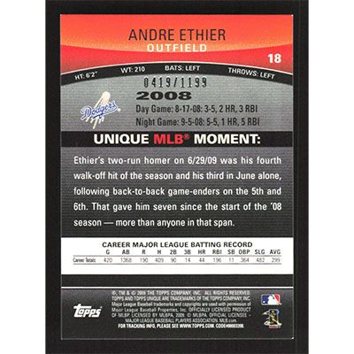 This is a 2009 Topps Unique Red Andre Ethier baseball card. The card is #18 and pictures show condition. This card is limited; #'d 0419/1199. Team(s): Los Angeles Dodgers