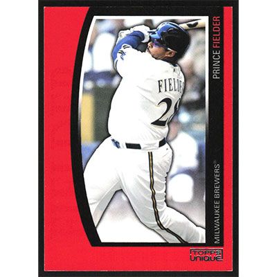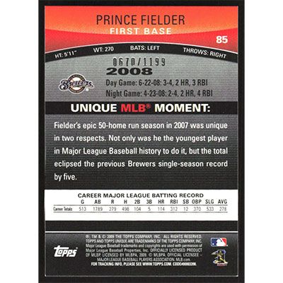 This is a 2009 Topps Unique Red Prince Fielder baseball card. The card is #85 and pictures show condition. This card is limited; #'d 0670/1199. Team(s): Milwaukee Brewers