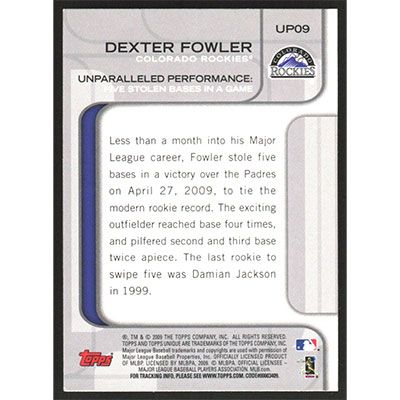 This is a 2009 Topps Unique Unparalleled Performances Dexter Fowler baseball card. The card is #UP09 and pictures show condition. Team(s): Colorado Rockies Rookie Card (RC)