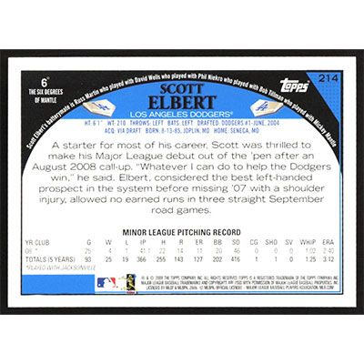 This is a 2009 Topps Wal-Mart Black Scott Elbert baseball card. The card is #214 and pictures show condition. Team(s): Los Angeles Dodgers Rookie Card (RC)