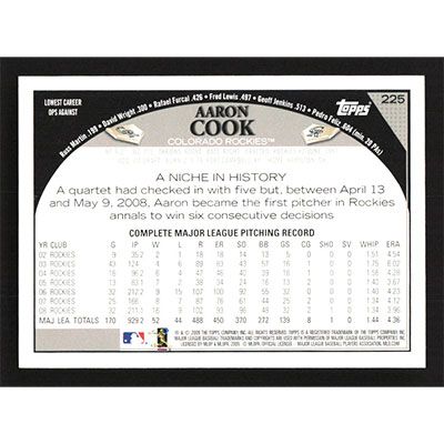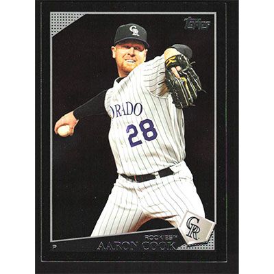 This is a 2009 Topps Wal-Mart Bllack Aaron Cook baseball card. The card is #225 and pictures show condition.