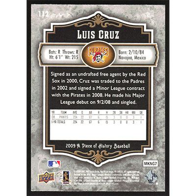 This is a 2009 UD A Piece of History Luis Cruz baseball card. The card is #112 and pictures show condition. Team(s): Pittsburgh Pirates Rookie Card (RC)