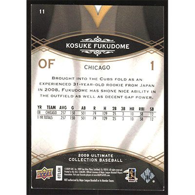 This is a 2009 Ultimate Collection Kosuke Fukudome baseball card. The card is #11 and pictures show condition. This card is limited; #'d 316/599. Team(s): Chicago Cubs