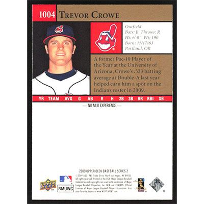This is a 2009 Upper Deck Trevor Crowe short print baseball card. The card is #1004 and pictures show condition. Team(s): Cleveland Indians Rookie Card (RC)