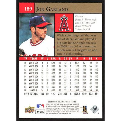 This is a 2009 Upper Deck Jon Garland baseball card. The card is #189 and pictures show condition.