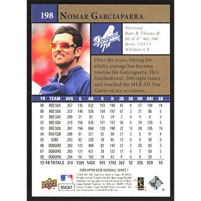 This is a 2009 Upper Deck Nomar Garciaparra baseball card. The card is #198 and pictures show condition.