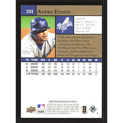 This is a 2009 Upper Deck Andre Ethier baseball card. The card is #201 and pictures show condition.