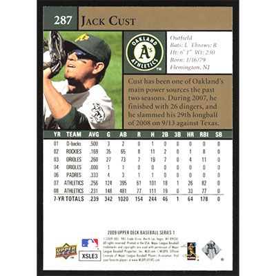 This is a 2009 Upper Deck Jack Cust baseball card. The card is #287 and pictures show condition.