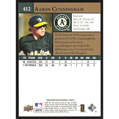 This is a 2009 Upper Deck Aaron Cunningham baseball card. The card is #412 and pictures show condition.