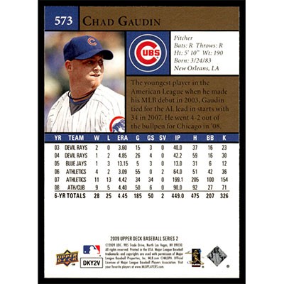 This is a 2009 Upper Deck Chad Gaudin baseball card. The card is #573 and pictures show condition.