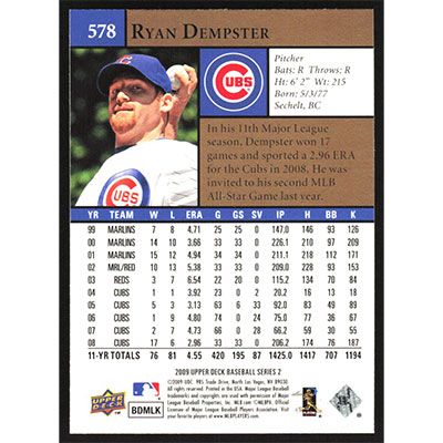This is a 2009 Upper Deck Ryan Dempster baseball card. The card is #578 and pictures show condition.