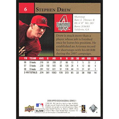This is a 2009 Upper Deck Stephen Drew baseball card. The card is #6 and pictures show condition.
