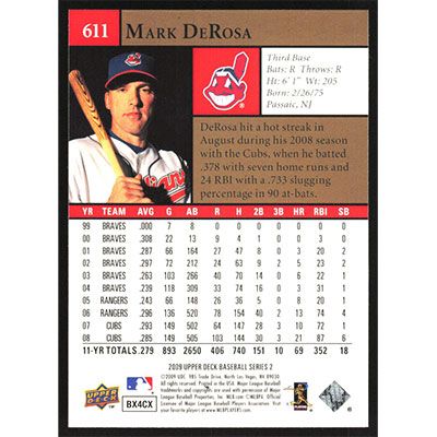 This is a 2009 Upper Deck Mark DeRosa baseball card. The card is #611 and pictures show condition.