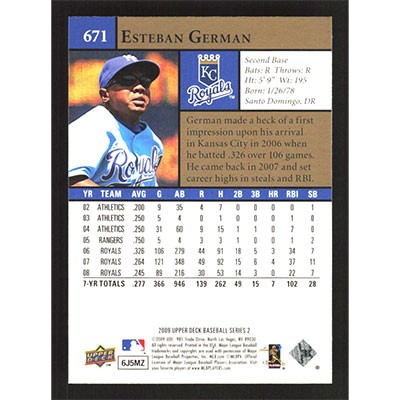 This is a 2009 Upper Deck Esteban German baseball card. The card is #671 and pictures show condition.