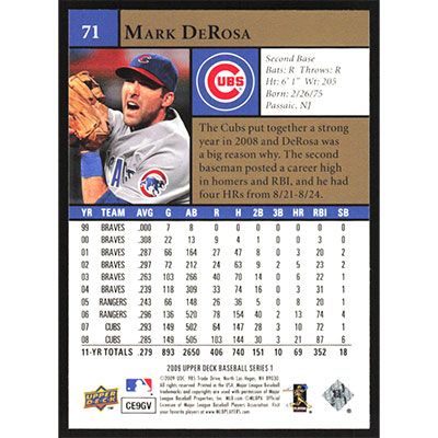 This is a 2009 Upper Deck Mark DeRosa baseball card. The card is #71 and pictures show condition.