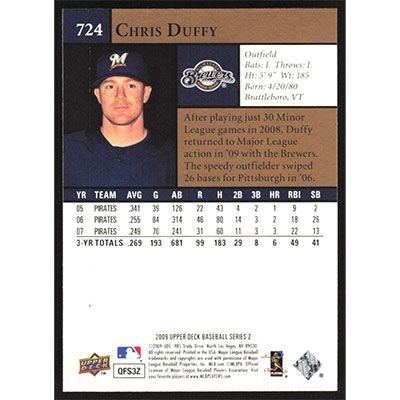 This is a 2009 Upper Deck Chris Duffy baseball card. The card is #724 and pictures show condition.