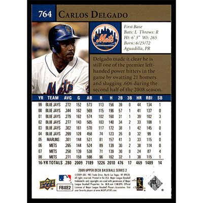 This is a 2009 Upper Deck Carlos Delgado baseball card. The card is #764 and pictures show condition.