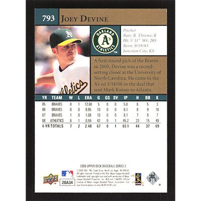 This is a 2009 Upper Deck Joey Devine baseball card. The card is #793 and pictures show condition.