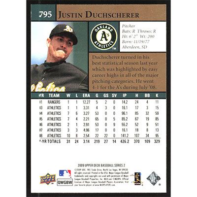 This is a 2009 Upper Deck Justin Duchscherer baseball card. The card is #795 and pictures show condition.