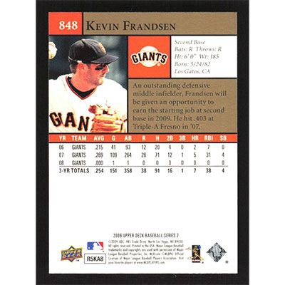 This is a 2009 Upper Deck Kevin Frandsen baseball card. The card is #848 and pictures show condition.