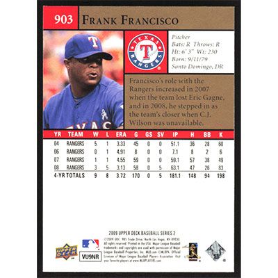 This is a 2009 Upper Deck Frank Francisco baseball card. The card is #903 and pictures show condition.