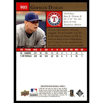 This is a 2009 Upper Deck German Duran baseball card. The card is #905 and pictures show condition.