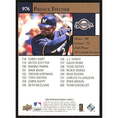 This is a 2009 Upper Deck Prince Fielder Team Checklist baseball card. The card is #976 and pictures show condition.