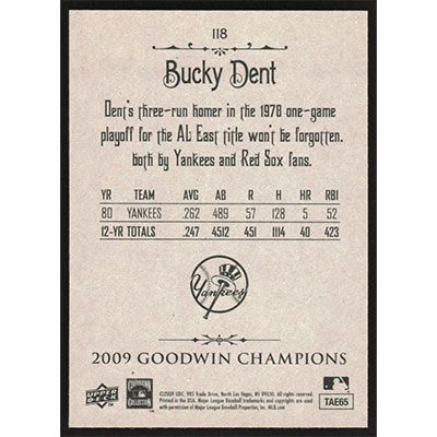 This is a 2009 Upper Deck Goodwin Champions Bucky Dent baseball card. The card is #118 and pictures show condition.