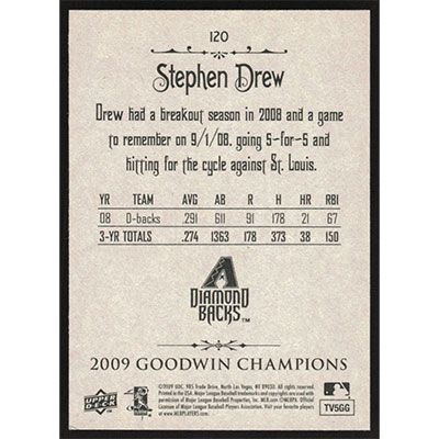 This is a 2009 Upper Deck Goodwin Champions Stephen Drew autographed baseball card. This card has been signed, in blue, by Stephen Drew, and is guaranteed authentic by Ballcardz.com. The card is #120 and pictures show condition.