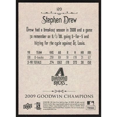 This is a 2009 Upper Deck Goodwin Champions Stephen Drew baseball card. The card is #120 and pictures show condition.
