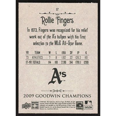 This is a 2009 Upper Deck Goodwin Champions Rollie Fingers baseball card. The card is #17 and pictures show condition.