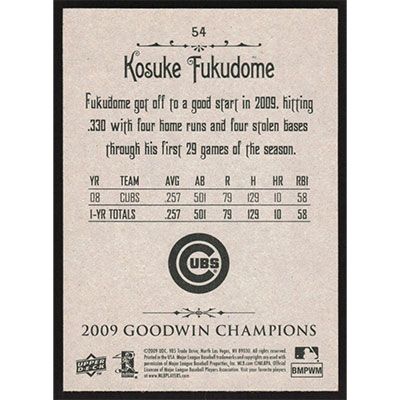This is a 2009 Upper Deck Goodwin Champions Kosuke Fukudome baseball card. The card is #54 and pictures show condition.