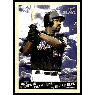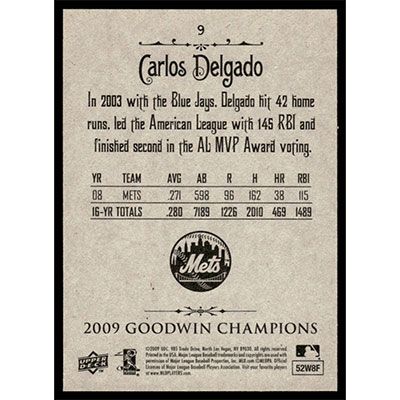 This is a 2009 Upper Deck Goodwin Champions Carlos Delgado baseball card. The card is #9 and pictures show condition.