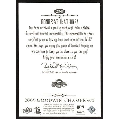 This is a 2009 Upper Deck Goodwin Champions Memorabilia Prince Fielder Jersey baseball card. The card is #GCM-PF and pictures show condition. Team(s): Milwaukee Brewers