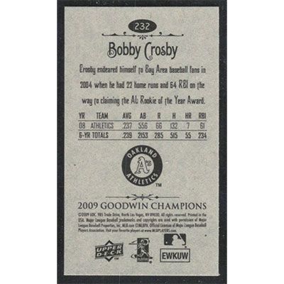This is a 2009 Upper Deck Goodwin Champions Mini Bobby Crosby baseball card. The card is #232 and pictures show condition.