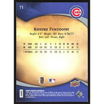 This is a 2009 Upper Deck Icons Kosuke Fukudome baseball card. The card is #71 and pictures show condition.