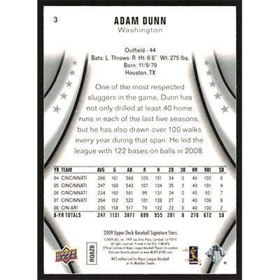 This is a 2009 Upper Deck Signature Stars Adam Dunn baseball card. The card is #3 and pictures show condition.