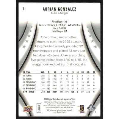This is a 2009 Upper Deck Signature Stars Adrian Gonzalez baseball card. The card is #6 and pictures show condition.