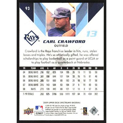 This is a 2009 Upper Deck Spectrum Carl Crawford baseball card. The card is #93 and pictures show condition.