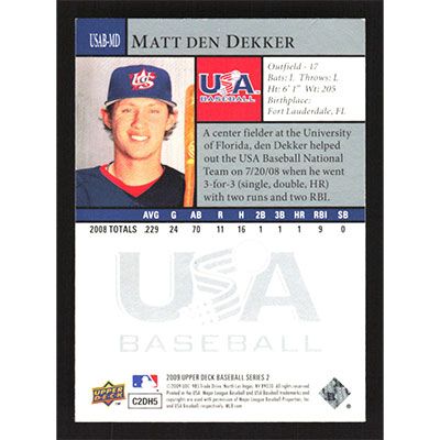 This is a 2009 Upper Deck USA National Team Matt den Dekker autographed baseball card. This card has been signed, in blue, by Matt den Dekker, and is guaranteed authentic by Ballcardz.com. The card is #USAB-MD and pictures show condition.