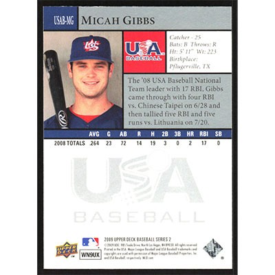 This is a 2009 Upper Deck USA National Team Micah Gibbs baseball card. The card is #USAB-MG and pictures show condition.