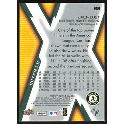 This is a 2009 Upper Deck X Jack Cust baseball card. The card is #68 and pictures show condition.