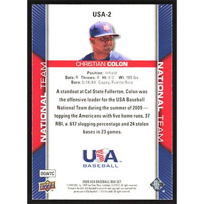This is a 2009 USA Baseball Christian Colon autographed baseball card. This card has been signed, in blue, by Christian Colon, and is guaranteed authentic by Ballcardz.com. The card is #USA-2 and pictures show condition.