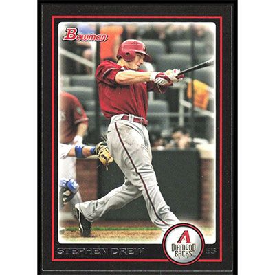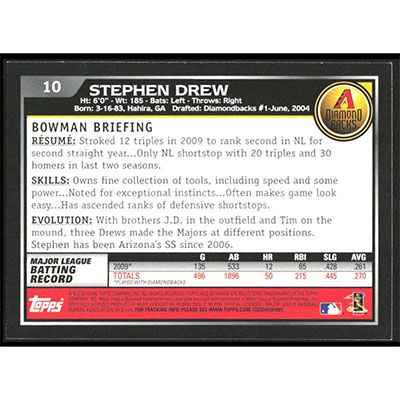 This is a 2010 Bowman Stephen Drew baseball card. The card is #10 and pictures show condition.